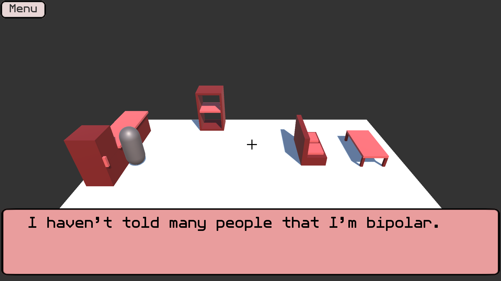 A small game about exploring my experiences of living with bipolar by walking around a room and engaging with random paragraphs from a blog I've been keeping since the day I was diagnosed. The game is designed to be taken at whatever pace the player desires and has options to filter out potential triggers for players as well.